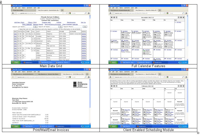 Feature List: Written in PHP with MySQL database engine, Data exportable, as ascii, to Excel and other industry standard programs, full backup of all Ptools Server Program and Data files to your local computer, full featured Calendar System, Client Enabled Scheduling from your web site option, Invoicing, Email your clients directly from Ptools with appointment reminders, invoices, or estimates (even send a text message to a client cell phone). Postcard MailMerge and Letter MailMerge in PDF Format. Mailing Labels, Custom Labels, and Business Cards in PDF format. Email MailMerge, Pre-Scheduling, Import Tool for other contact lists, powerful Data and Search Filters, Smartphone Optimization features, multiple customer data files, 20+ page manual, and much more.